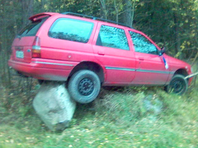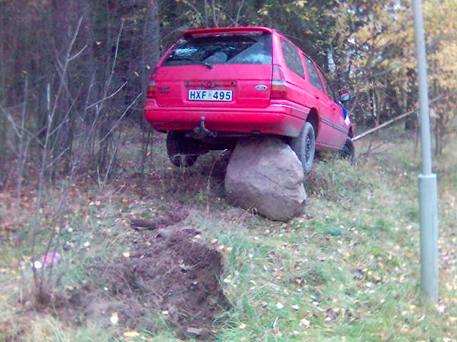 Som ni kan se så har dom alltså kört (den stulna) bilen ut i naturen, sedan tagit en megabumling till sten ur sin grop, lyft upp bilen för att därefter rulla in stenen under bilen. Så vi konstaterade att dom måste vara väldigt duktiga på sammarbete också.