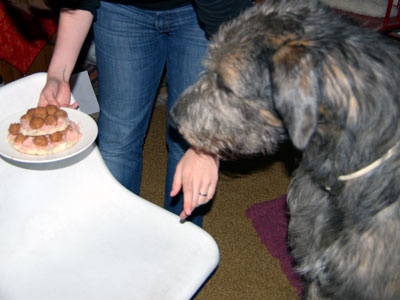 Idag är det min födelsedag!! Jag har blivit hela 3 år gammal. Matte och husse var snälla och ordnade med en liten bakelse åt mig med leverpastej och köttbullar. Den var jättegod!!